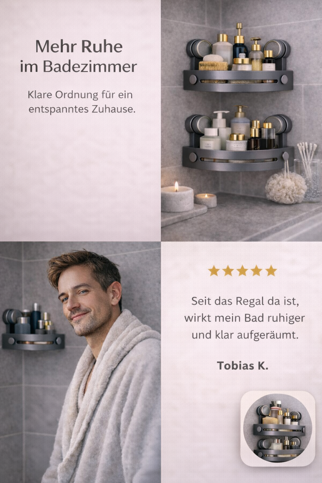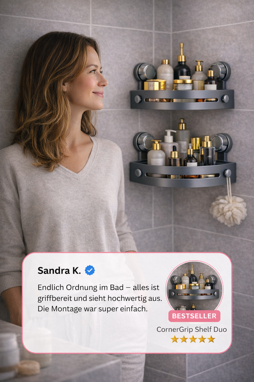 Das CornerGrip™ Shelf nutzt ungenutzte Ecken in deinem Bad und schafft sofort mehr Platz. In Sekunden befestigt, stabil im Halt und ideal für Dusche & Bad.